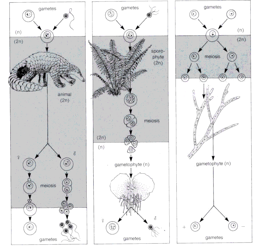 Yet, as mentioned earlier, when meiosis occurs in the life cycle of organisms is not always the same. Let's compare three typical life cycle patterns and look at the timing of meiosis in the life cycle of each.