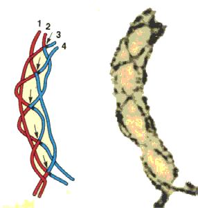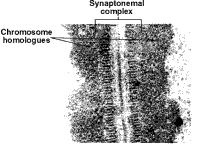 The synaptonemal complex allows for a process of genetic importance to occur. Portions of intertwined chromatids of the homologous chromosomes unwind and the single-stranded DNA molecule sections base-pair to complementary strands of a non-sister chromatid of the homologue. This results in an exchange of DNA portions between the homologous chromosomes with the structure of the synaptic complex. This exchange is called crossing over. Crossing over occurs between the non-sister chromatids, and is mediated by enzymes. If the specific DNA of the homologues were different forms of genes, then recombination occurs. The sister chromatids now have some genetic variation; they are no longer precisely identical.