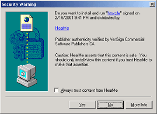 Step One: You will be prompted with a window asking if you want to install "hmvcfe" from HearMe.