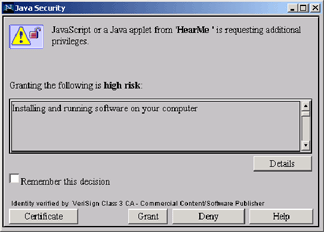 whether to GRANT or DENY the HearMe installation. Click GRANT.